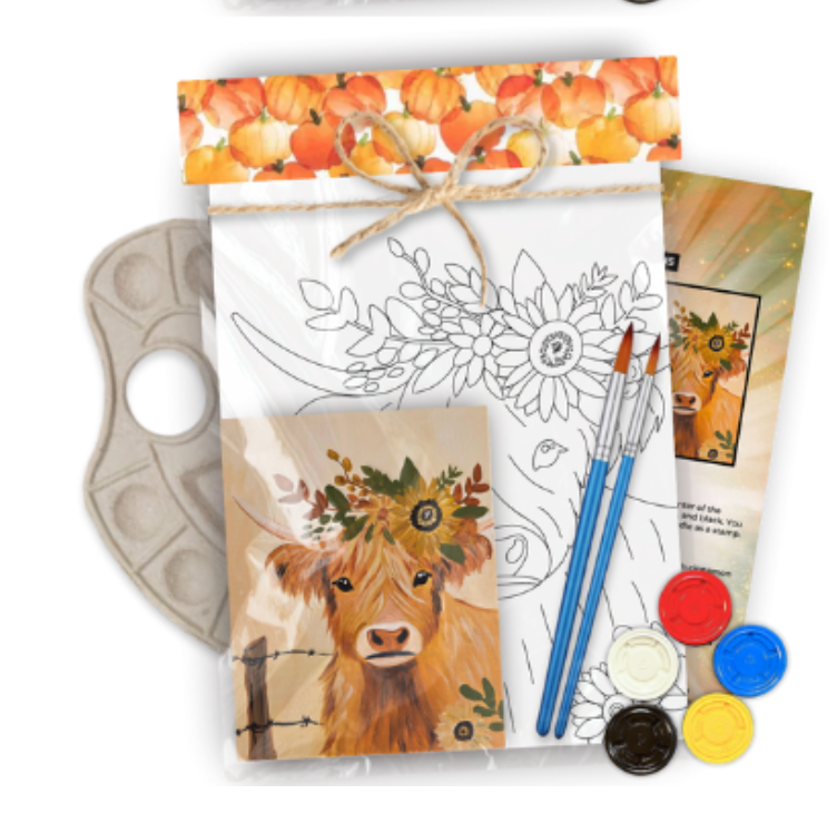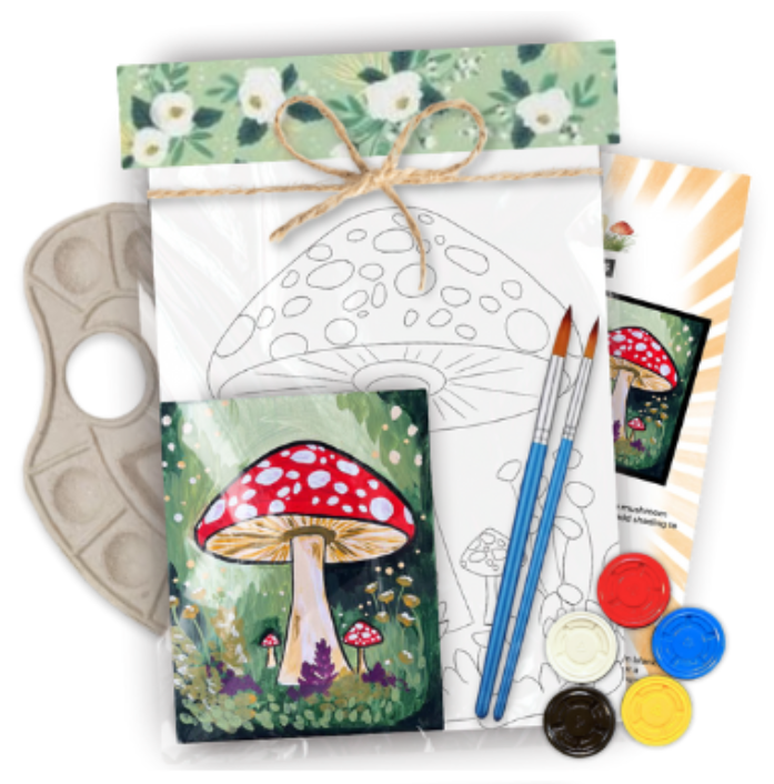 Paint kit with 8x10 canvas, paint, brushes, and step-by-step instructions perfect for all skill levels and paint party enthusiasts.